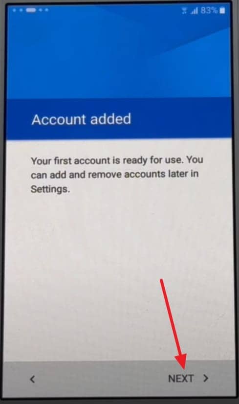 Step 7. When done, restart the phone and proceed until you reach a notification that will confirm that an account has been added. Finally, press "Next" and start setting up your J7, as it is now FRP-free.