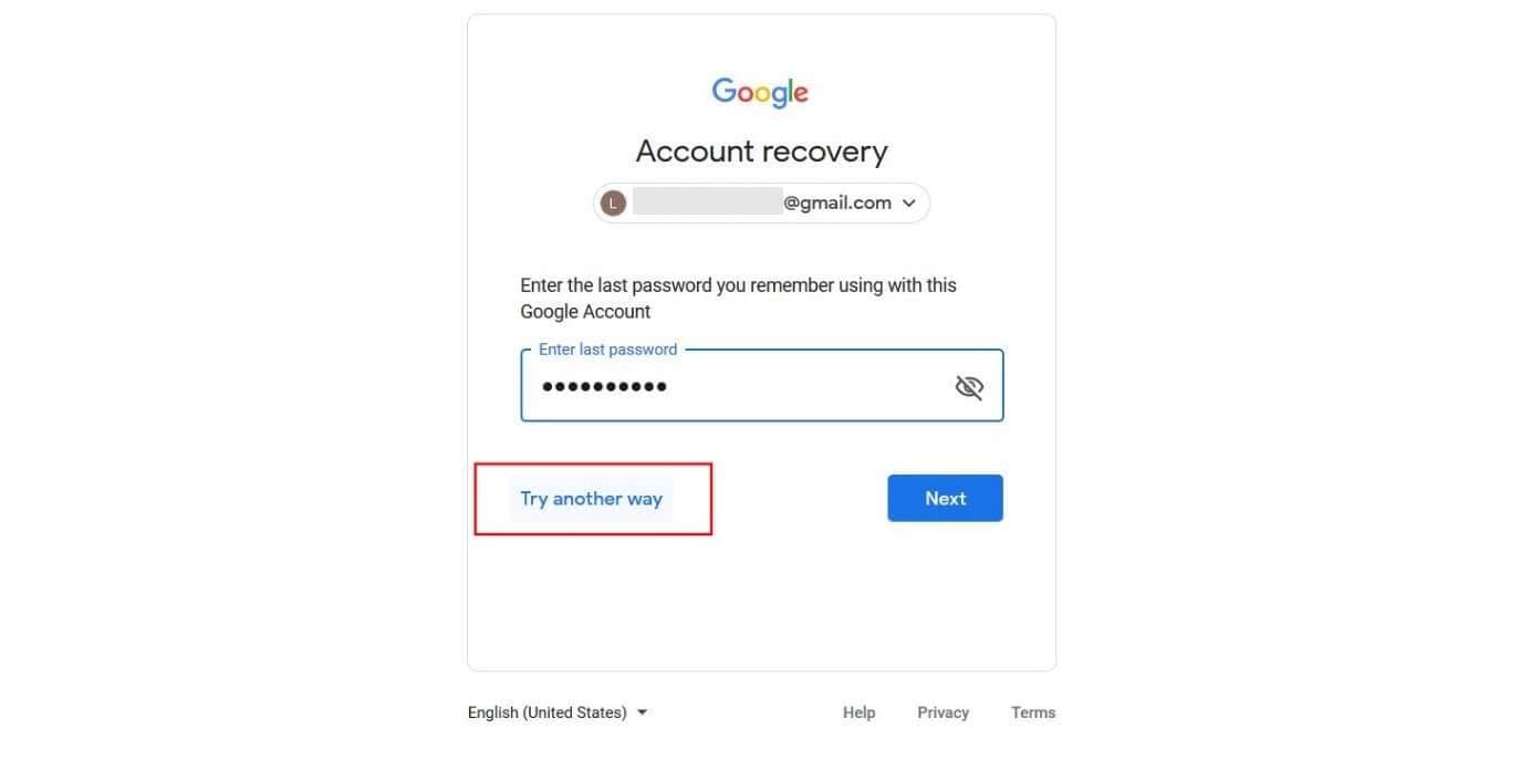 Step 2. Here, tap the "Next" button and select the "Forgot password?" option when the following screen appears. From there, opt for a recovery approach by exploring different options via "Try another way."