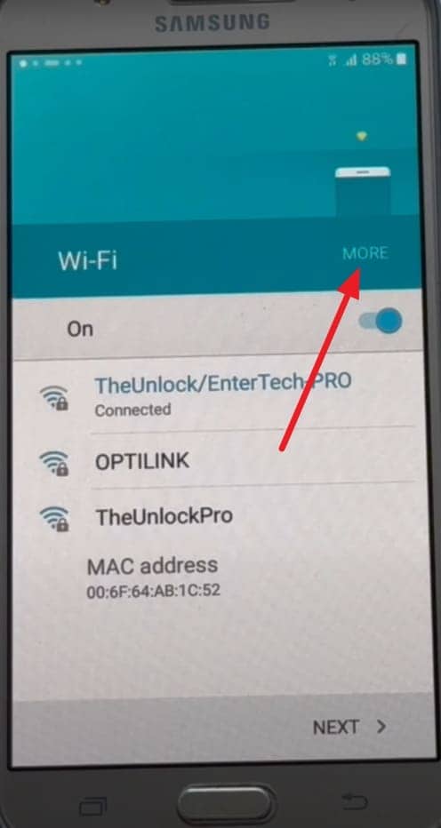 Step 1. First, power on the Samsung J7 to establish a Wi-Fi connection and verify that the FRP lock is in place. Afterward, return to the Wi-Fi settings and tap "More" to proceed.