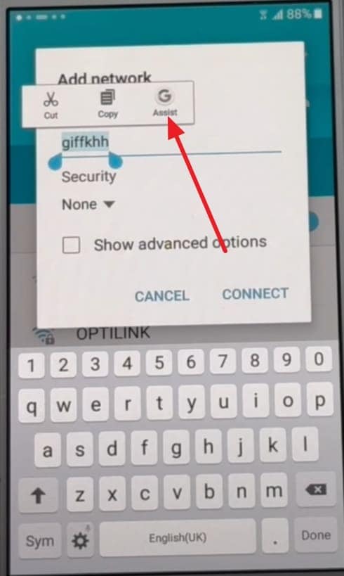 Step 2. Here, select "Add Network" and type any random text in the field to highlight it. Following that, choose "Assist" to approach the Google search bar on the phone.