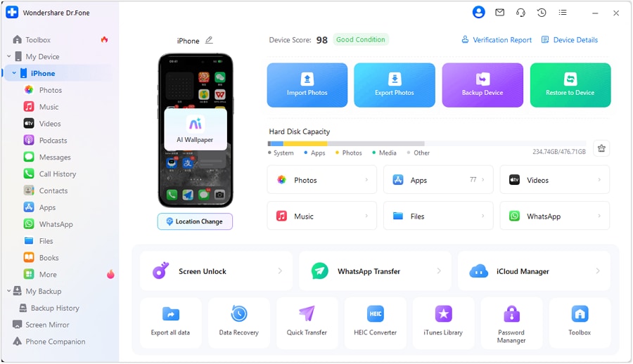 Dr.Fone provides a complete set of tools for solving all iOS/Android phone problems.