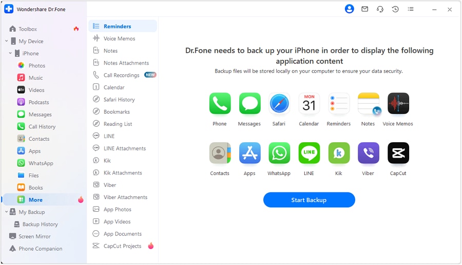 Social applications and their data are also available and previewed within Dr.Fone. However, there is a specific provision that needs to be completed before accessing the data. The data of these social apps needs to be backed up on the platform before it can be previewed. To find out how social apps are managed across Dr.Fone, follow the steps guided next: