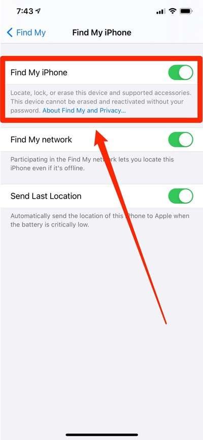 - Go to "Settings > Apple ID > Find My iPhone" and disable the feature.