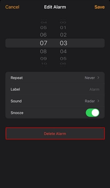 Step 2: Now, tap "Edit" from the top left corner and press the minus icon next to the problematic alarm. Remove the alarm by tapping the "Delete" option.