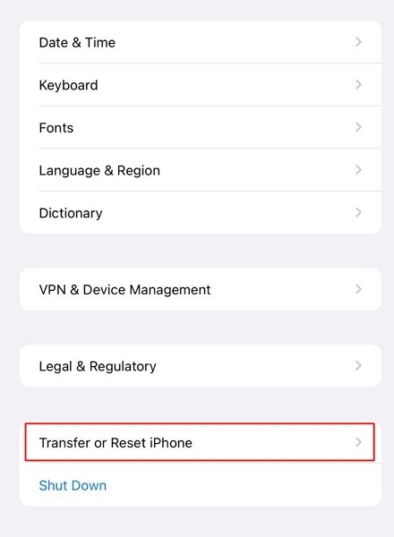 Step 1: You will need to open Settings on your iPhone and press "General." Now, find the "Transfer or Reset iPhone" option near the bottom end of the options and tap it.